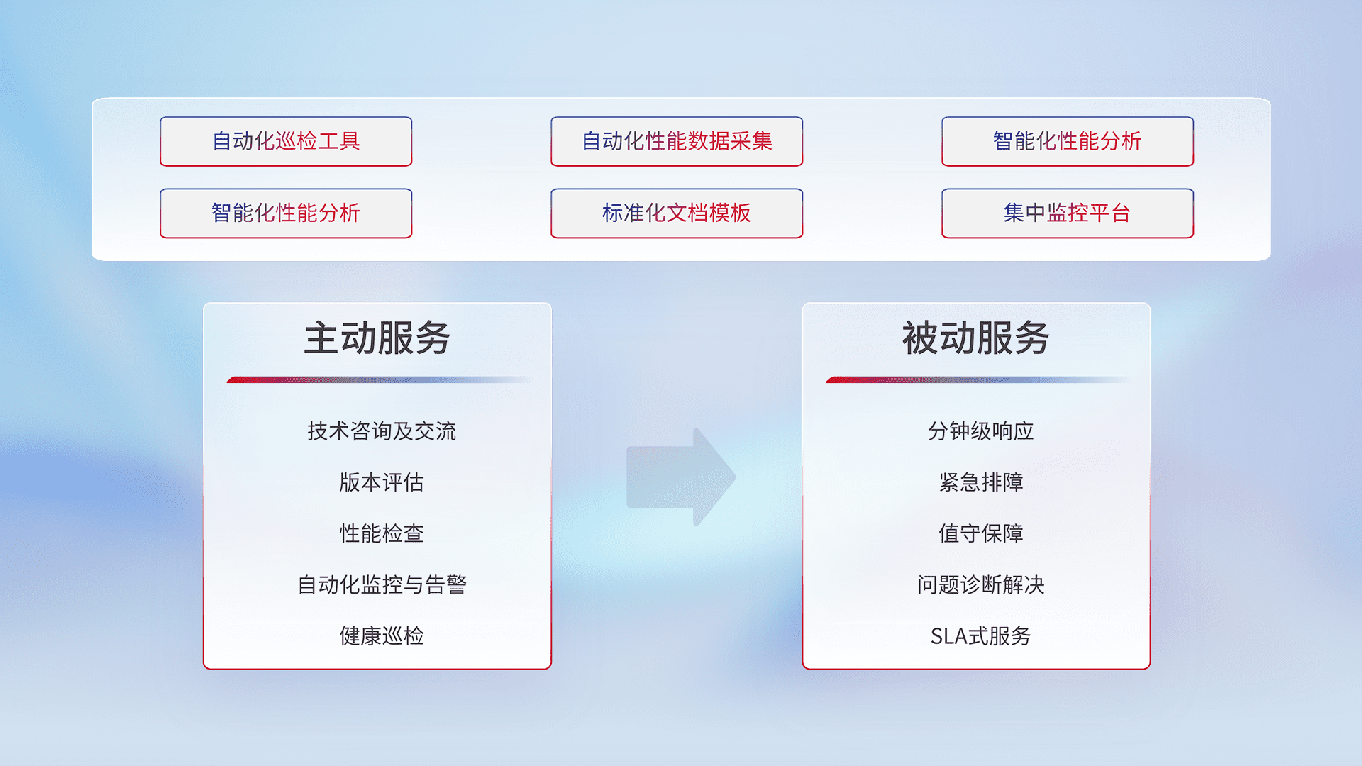 智能化工具和标准化文档,,保障服务质量,,,,提供主动服务(包含技术咨询、、、版本评估、、、性能检查、、、、自动化监控与告警、、健康巡检)和被动服务包含(分钟级响应、、、紧急排障、、、、值守保障、、、、问题诊断解决、、、、SLA服务)。。。。